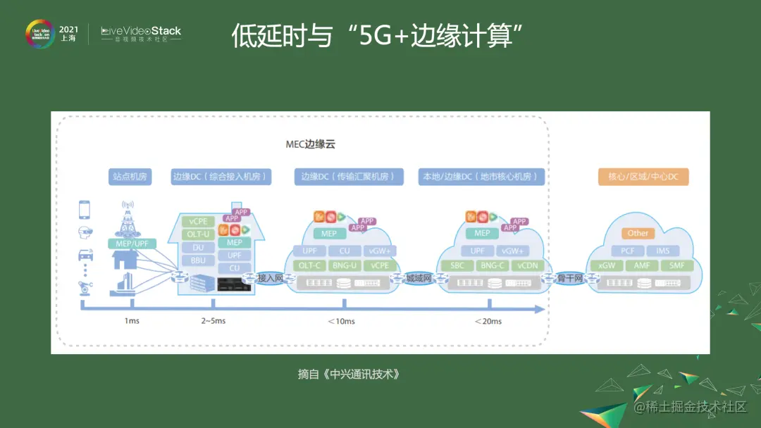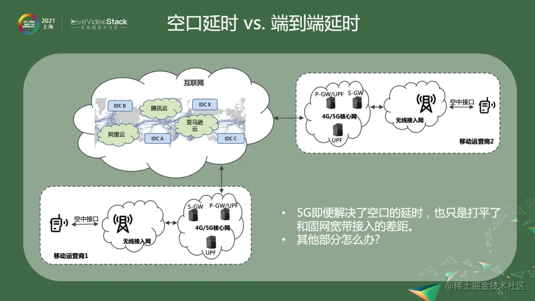 我们一直在说的5G低延时,其实说的就是手机到基站的这段低延时。而端到端的过程会经过空口到承载到核心网,从核心网再到公网,经过若干个IDC有可能换到另外一个运营商的核心网,再到接入网最后抵达空口。坦白来说,即使5G的空口可以做到零或一毫秒延时,最多也就是打平了和固网的差距。如果用有线接入的话,事实上空口这个环节怎么样都是比不过的。我们真正需要的是端到端的低延时,剩下的部分怎么办?