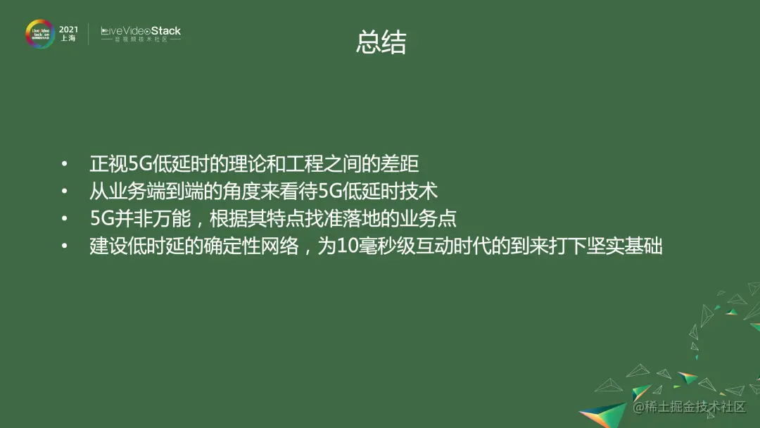 简单做个总结:5G的延时在理论上和工程数据上是有相当的差距的,我们需要正视这个问题;我们更多的不只是需要空口的超低延时,而是端到端的低延时;5G不是万能的,它更多的只是从空间维度扩大了你的业务,把你之前无法做到的业务扩展开来;从技术上来说,为了迎接我们的10毫秒级低延时时代,我们需要自建一条累加的低延时确定性网络。今天的分享先到这,谢谢大家!