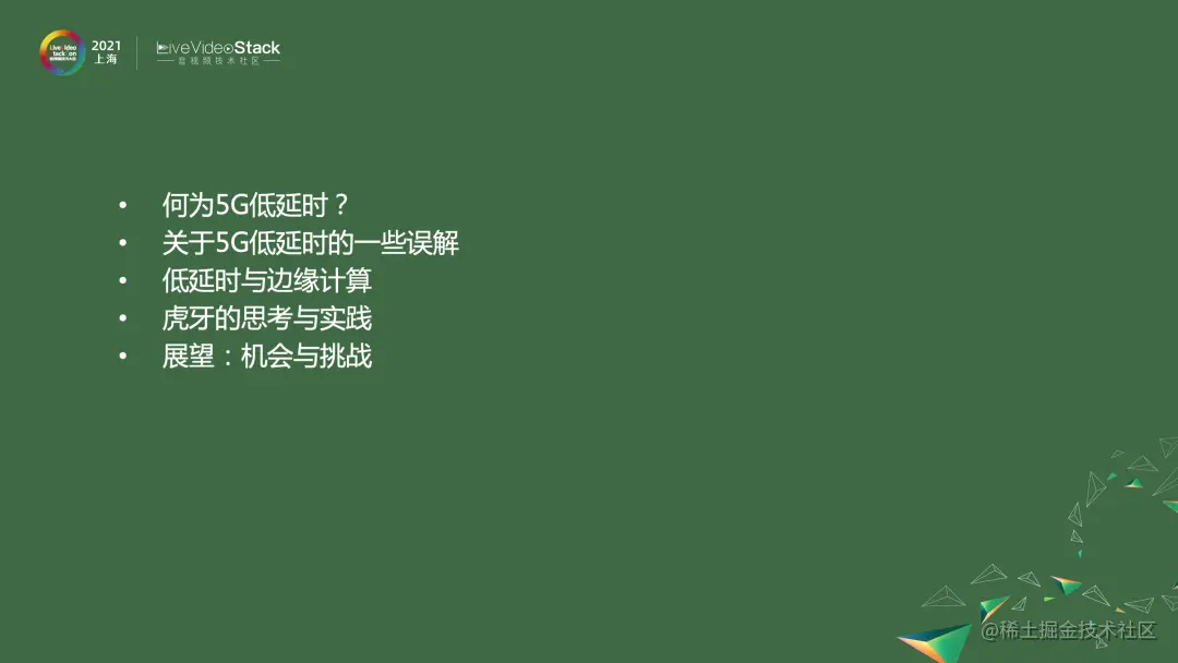 我们想先讲一下何为5G低延时?它是如何实现的,我会剖析一下5G低延时的误区;另外包括MEC(多接入边缘计算),它和5G是密切相关的;还有虎牙在5G低延时或MEC上的一些实践;最后聊一聊虎牙在5G低延时方面的思考,以及未来的挑战与机会。