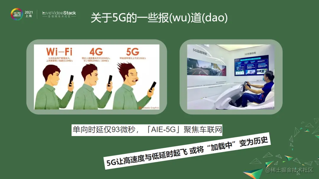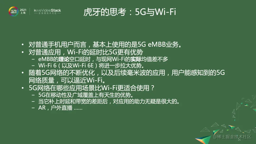 现在我想讲一讲虎牙对于5G低延时的思考,我们内部讨论了很多关于Wi-Fi和5G的关系。通过全网数据你会发现用户的两个通道,一个是Wi-Fi,一个是4G,坦白来说大部分流量还是来自于Wi-Fi,来自于家庭宽带的流量。对于手机4G用户来说,也很少会用到运营商提供的超低延时的服务。即使到了5G,我们大概率也不会用到URLLC,也不会用MTC这种物联网专用网络,我们使用更多的还是eMBB的业务。在空口中,eMBB的RTT是8毫秒,而好一点的Wi-Fi可以做到2毫秒。市面上质量较差的Wi-Fi是因为还在使用2.4G频段(易被干扰)或Wi-Fi 4或较差的AP网关。坦白来说,如果在座各位能够让自己平台所有用户的Wi-Fi及时升级,相信能减少不少视频卡顿率。eMBB的理论延时比Wi-Fi的实际延时还会高一些,甚至现在的Wi-Fi 6以及抗干扰的Wi-Fi 6E(使用新频段,不会受到2.4G或5G的影响),有可能更加拉大了Wi-Fi和5G的延时差距。我们能做的就是等待,看看5G在现网优化的情况如何,以及毫米波的应用。毫米波并未在我国广泛使用,我们使用的是SUB-6G的频段。毫米波覆盖范围有限,但是可用的频宽资源很多,所以可以达到很大的带宽,在未来会在我国一些热点技术作为补强的应用。一旦毫米波进入市场,我认为有可能缩小5G和Wi-Fi低延时上的差距,当然能做的只是缩小差距,当然这只是我一家之言。那这时候有个问题就出现了,如果在延时上比不过Wi-Fi,我们如何定位5G?5G在移动性、广域覆盖方面比Wi-Fi有优势,我们不可能背着Wi-Fi到处走,尤其是户外场景。所以我们需要自己判断,哪些业务、场景适合使用5G。5G在广域覆盖上的优势值得被关注,我们需要考虑它和我们的业务是否有亲和性。我个人认为类似于AR,AR眼镜,户外直播等这种业务和5G就有比较好的亲和性。顺带一提,我不会为5G+VR这类产品买单,因为VR和5G并没有什么关系,VR更多的是在室内的应用,在室内Wi-Fi不比5G更好用吗?同时5G还存在流量资费的问题。但是AR就不同了,因为我必须要走,必须和现场结合,户外直播同理。