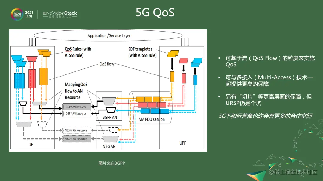5G的QoS相对来说更灵活,我们可以根据不同流设置不同PCC的规则,对应不同包的计费和质量保证的规则。它不是基于承载而是基于流,流的标识通常是三元组或是其他特征。上图和其他5G QoS图不太一样,因为它有涉及多接入技术的QoS。多接入(Multi-Access),比如在3GPP AN里面,5G除了通过空口来连接到目标地址以外,还可以通过非5G,如Wi-Fi等介质同时形成多接入通道,以此保证数据接入可靠性。但是3GPP毕竟代表的是运营商或是设备商的利益,所以这一特性未必能得到广泛的运用,比如我们在做传输时通常会考虑同时使用Wi-Fi、4G、5G或是MP-TCP这种特性来做多路的传输,这些我们通常在应用层实现。3GPP试图在底层将这套方式封装起来,但就我和其他应用厂商的讨论,似乎没有人愿意为这一方式买单,应用厂商更愿意自己把控这方面内容。另一个与QoS有对应关系的是切片。这部分内容我不会详细展开,因为内容过多。切片的目的是为了保证不同业务不同的优先级,但这项技术对手机来说是个“坑”,因为目前市面上5G手机对URSP的支持非常不足,几乎没有。虽然3GPP定义出来了,但是短期内,这项技术只能在to B场景应用,比如根据不同的DNN做一些不同切片的接入。对于目前的手机来说,很难从一个切片切换到另一个切片:理论上我们可以给不同的APP或是不同的流特性,映射到不同的切片享受不同的QoS保证,但是目前终端并不支持这项技术。