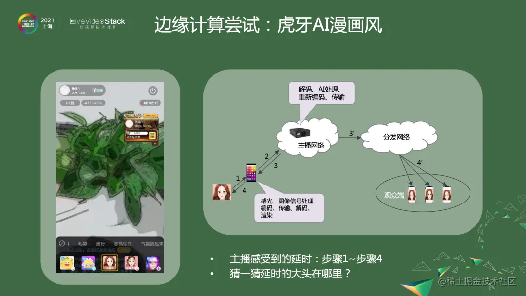 虎牙在边缘计算方面曾经做过一个尝试,我们在直播时希望给主播的形象做一些漫画风格的转换。但是我们发现很多主播的直播设备性能并不是特别优异,特别是一些低端或中端的手机,所以很难在手机做一些困难的AI风格转换。这时候我们想,能不能把计算这部分放到云端,利用低延时技术来实现。大致过程如下,主播的头像通过镜头到CMOS感光之后通过ISP的处理,然后在送到APP,APP做一些前处理,随后编码,通过网络传过去。边缘机房的AI节点必须先解码,随后在做一些相应的AI处理,这时又要重新编码一路流,随后分发给观众,另外一路流返回给主播,主播收到流后经过解码和渲染,这才能看到自己被变换过图像;这个过程对于主播的感受来说,就像是在手机上完成的一个处理。这是一个非常美好的想法。主播能感受到的延时就是图上1-4的步骤。那么大家觉得我们每个阶段,比如采集,编码,传输,解码,渲染延时最高的是哪个阶段?其实是采集阶段。安卓手机端或iphone11以下的机型,大家拿着摄像头对着自己,敏感的人是可以感受到延迟的,即使是自己的摄像头做本地的预览,延迟的时间在80-120毫秒之间。手机的操作无非就是成像,成像完成以后从传感器中读出来,然后送到ISP处理,处理完以后送去做渲染。安卓摄像头的管线深度和整个架构处理决定了延时的高低,这点当时被我们忽略了。在某些场景下,网络未必是瓶颈。网络可以做到很低延时,特别是在传输上,RTT20-30毫秒是可以达到的。对于一般的1080P手机编码就需要30~40毫秒,但是采集很有可能花费3帧的时间。所以我们在尝试边缘计算的时候,我们要想我们的瓶颈真的是在网络上吗?