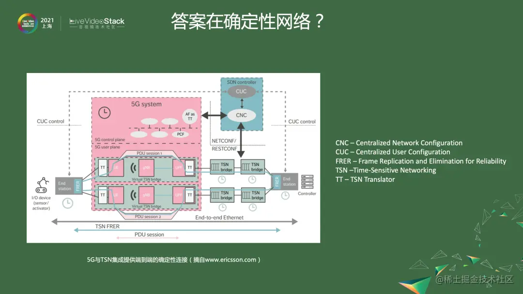 我们可以参考一下TSN(时间敏感型网络),它在工业互联网中是会被用到的网络,通过这个网络我们希望能够得到5G来实现端到端、高稳定的超低延时方案。最核心的点——冗余。从图中可以看到,控制器希望控制远端设备的时候,中间加入了5G网络。在END STATION,我们就分成了2路,接入2个终端,分别通过不同的传输通道进行传输。在5G中有不少类似于多链路、多路径的处理,这是值得我们借鉴的方式,鉴于时间原因,我无法展开更多。我想强调的是,端到端的低延时比整个空口的低延时更重要,我们可以从工业互联网中寻找灵感。