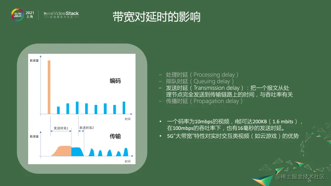 在座的很多同行应该是做视频的,除了无限GOP场景,对视频进行编码的时候存在I帧,后面紧接着P帧,可能还有B帧,依次循环。一个I帧很大,可能是P帧的很多倍,这取决于编码时的参数设定。假设可用带宽的平均码率是10兆,如果给我们一个10兆带宽的平滑流,我们确实可以很快的传输出去,但是视频是突发的,尤其对于I帧来说。最后我们会发现,I帧的传输会花费很多时间,甚至阻碍了下一帧,B帧或者P帧的传输。这里我列举一个数据,比如我上传一个10兆的视频流I帧可能会达到200kb,这时哪怕使用100兆的带宽去传输,可能也需要16毫秒,这是什么概念?如果在云游戏里,假设帧率是60,2帧的间隔就是16毫秒。也就是说10兆码流的视频我需要使用100兆的带宽传输才能让它不影响下一帧的传输。所以为什么我们说5G对于云游戏的发展是个有利优势,因为大带宽带来的是低延迟。4G很难做到很大的下行速率,而现在很多云游戏的厂商会用到20兆或25兆的带宽。