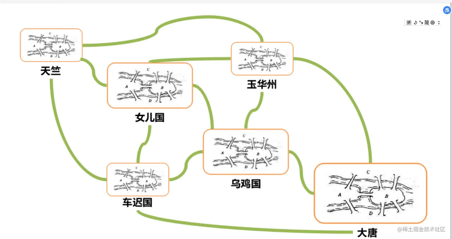 我们可以想象唐僧西天取经,需要解决两大问题,一个是在每个国家如何找到正确的路,去换通关文 牒、吃饭、休息;一个是在国家之间,野外行走的时候,如何找到正确的路、水源的问题。