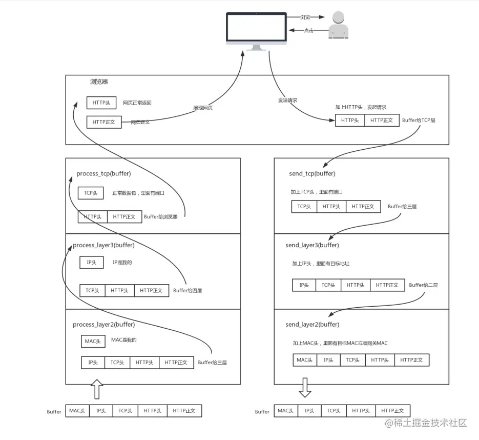 理解计算机网络中的概念,一个很好的角度是,想象网络包就是一段 Buffer,或者一块内存,是有格式 的。同时,想象自己是一个处理网络包的程序,而且这个程序可以跑在电脑上,可以跑在服务器上,可 以跑在交换机上,也可以跑在路由器上。你想象自己有很多的网口,从某个口拿进一个网络包来,用自 己的程序处理一下,再从另一个网口发送出去。 当然网络包的格式很复杂,这个程序也很复杂。复杂的程序都要分层,这是程序设计的要求。比如,复 杂的电商还会分数据库层、缓存层、Compose 层、Controller 层和接入层,每一层专注做本层的事 情。