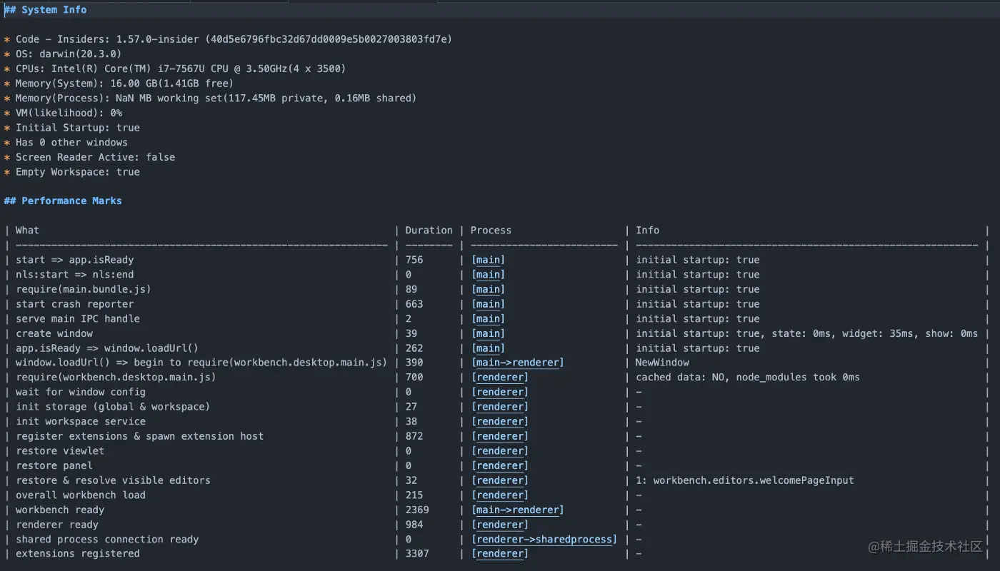 如果您想清楚地了解 VS Code 启动时发生的所有事情,您可能需要查看 cmd + p > Developer Startup Performance。