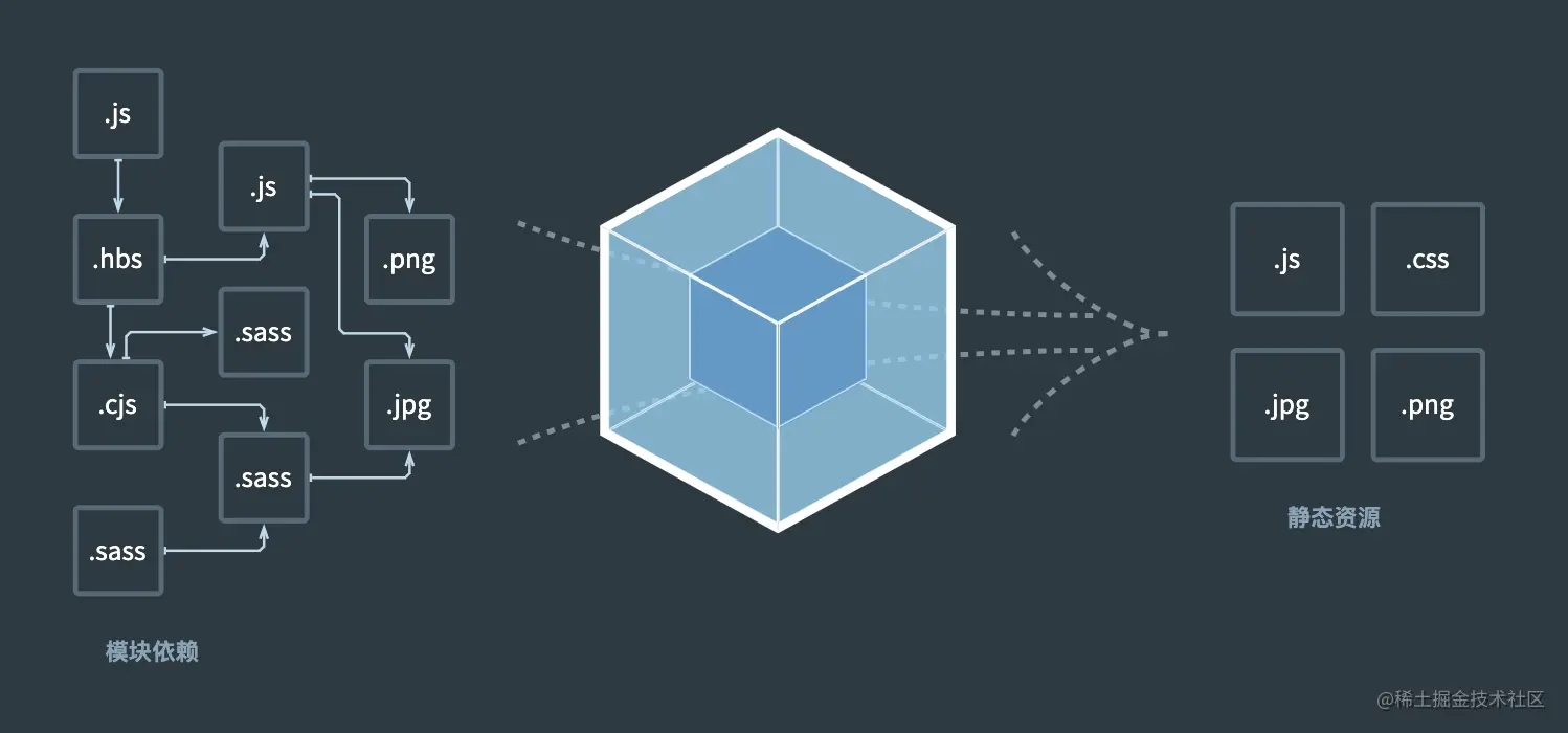 其官网的首页图很形象的画出了 Webpack 是什么,如下: