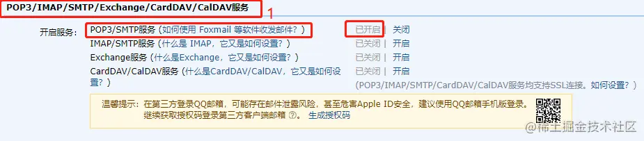 第二步:开启POP3/SMTP,点击开启后会生成一段字符串(token),这里辰哥已经开启了