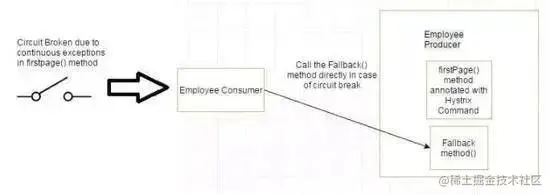 如果 firstPage method() 中的异常继续发生,则 Hystrix 电路将中断,并且员工使用者将一起跳过 firtsPage 方法,并直接调用回退方法。断路器的目的是给第一页方法或第一页方法可能调用的其他方法留出时间,并导致异常恢复。可能发生的情况是,在负载较小的情况下,导致异常的问题有更好的恢复机会 。