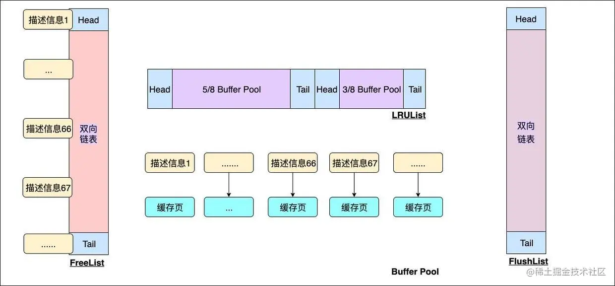 除了缓存页之外,你还能看到Buffer Pool中存在三个双向链表。分别是FreeList、LRUList以及FlushList。这三个双向链表中维护着缓存页的描述信息。