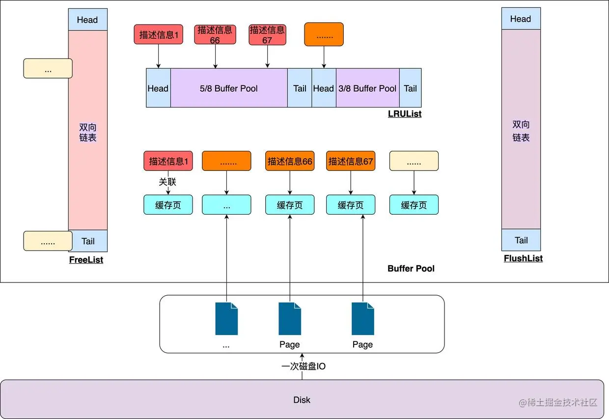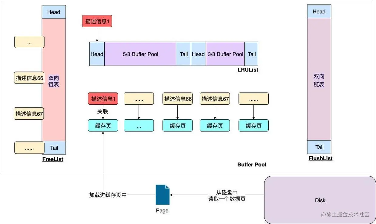 因为发生了预读,所以你的一次磁盘IO读出了大量的数据页,但是这些数据页中很可能是有一些是你根本不需要的,仅仅是预读把它们级联查出来了。这时按老规矩,从FreeList中找到空闲的缓存页信息,然后将其从FreeList中移除。根据找到的空闲缓存页的描述信息,将从磁盘中读取出来的数据页加载进去。相应的该缓存页的描述信息也会被维护进LRU链表的冷数据区域。