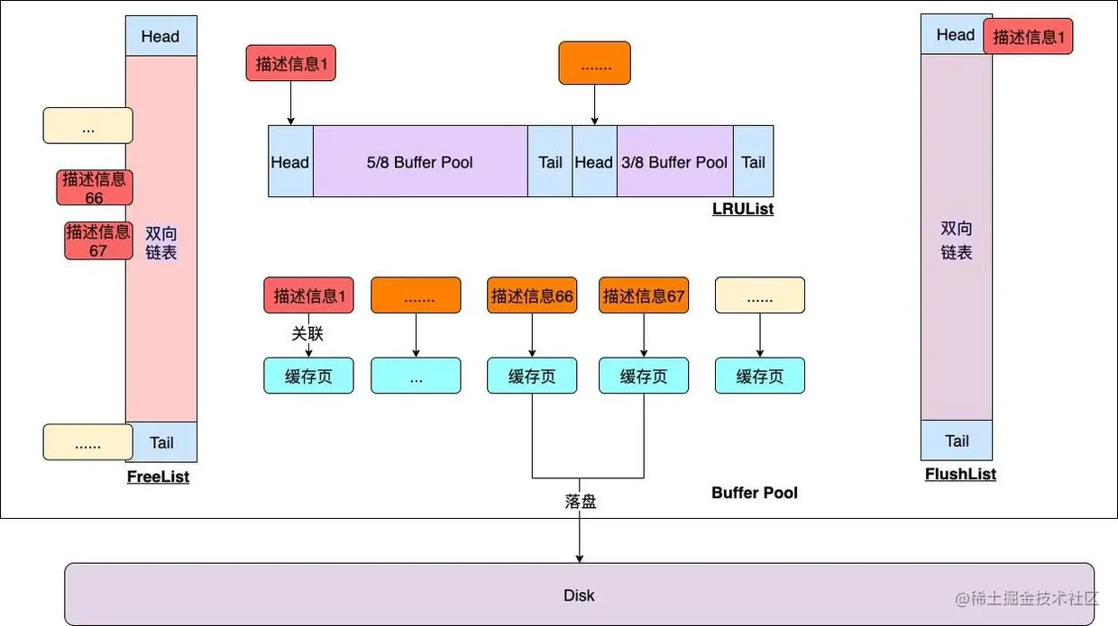描述信息66、67指向的缓存页被刷新进磁盘。 同时从FlushList中将其移除,然后存入FreeList中。完成一个循环