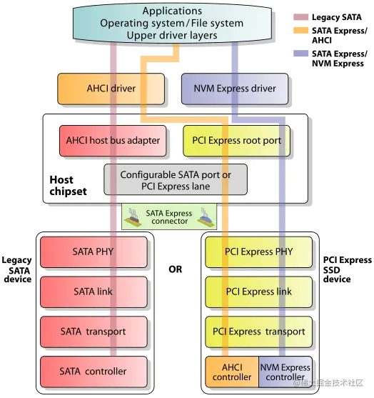 SATA Express软件体系结构的一个高层次概览,这也适用于M.2。它支持传统SATA和PCI Express存储设备,包括AHCI和NVMe作为逻辑设备接口。