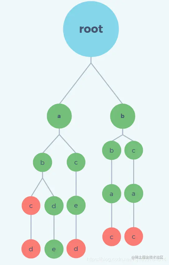 其中红色的节点表示,存在一个以该节点为结尾的字符串