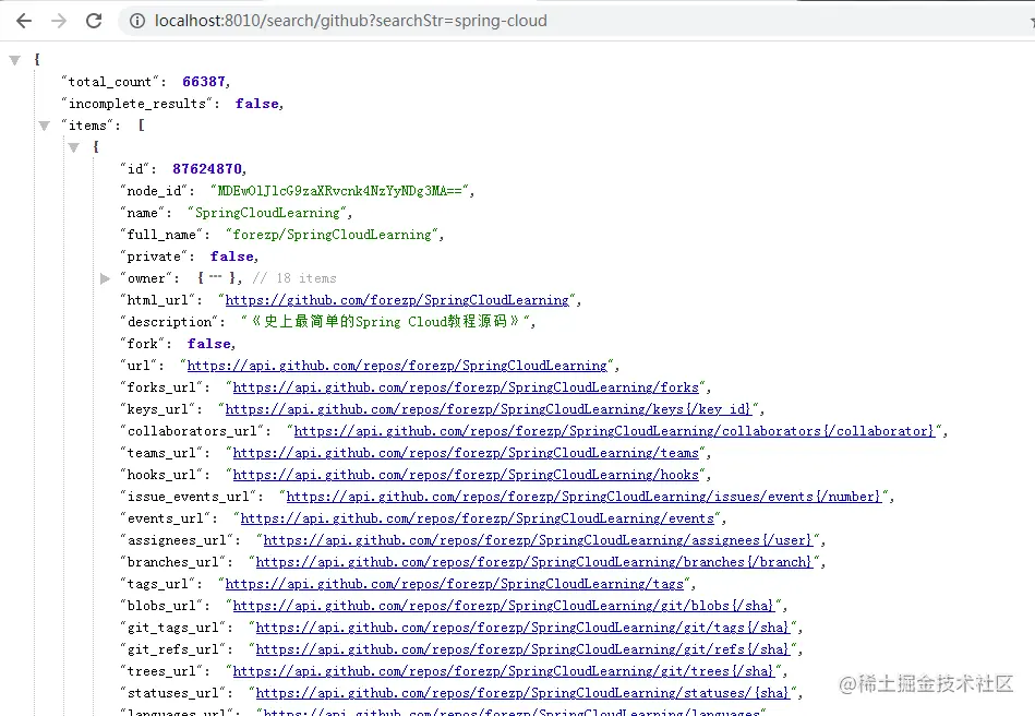 运行启动类之后,在浏览器或者PostMan之类的工具访问http://localhost:8010/search/github?searchStr=spring-cloud