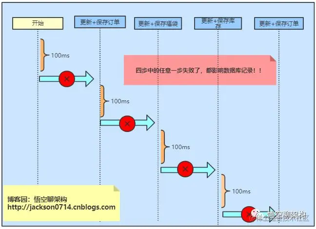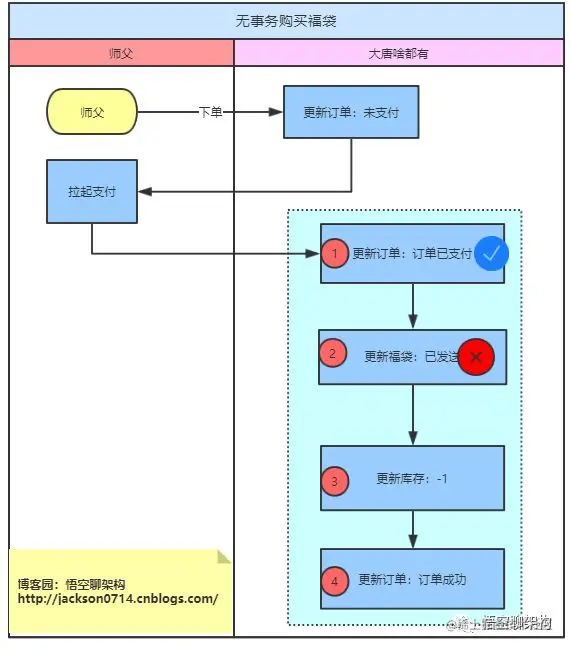 如果第一步执行成功,第二步执行失败了,抛出了异常,则第一步订单状态还是订单成功的,福袋状态未更新,也就是师父遇到的问题。