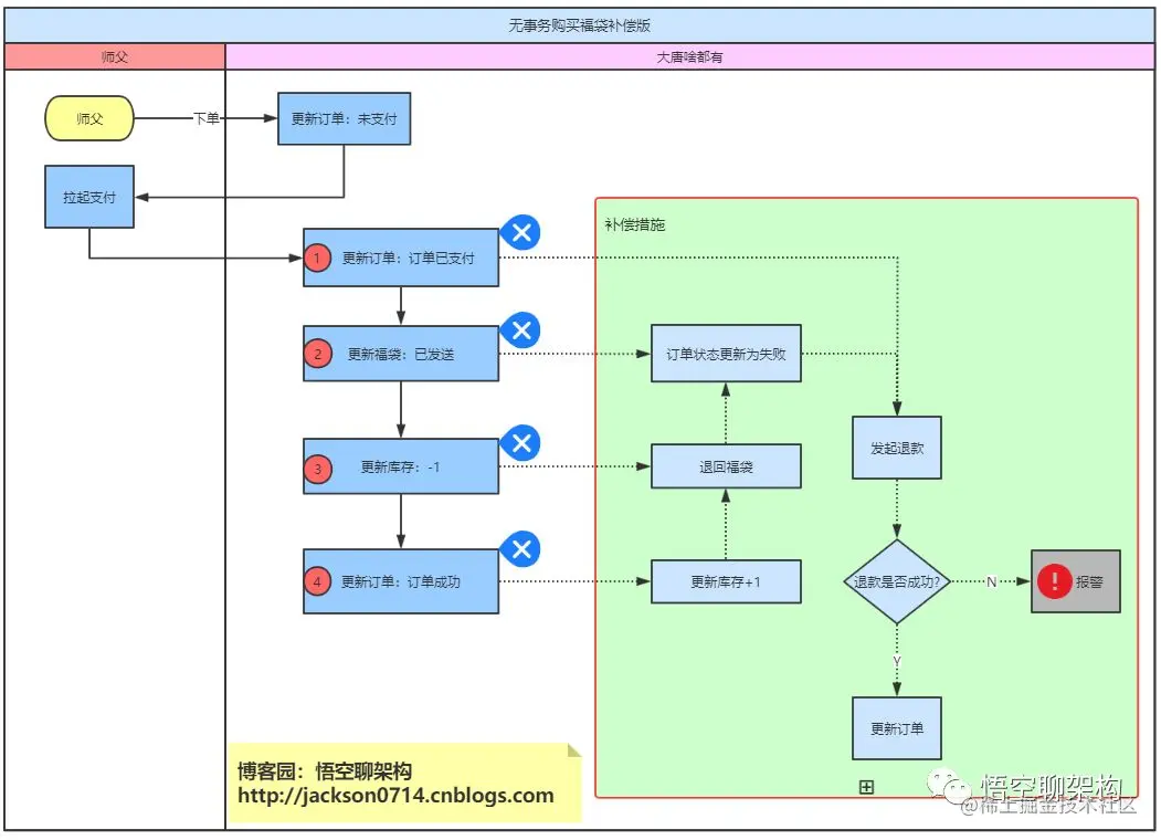 悟空:也就是说第一步顶单状态从未支付到订单成功已经执行成功了,但是第二步更新福袋的时候失败了,没有自动将第一步订单的状态给改回去?
