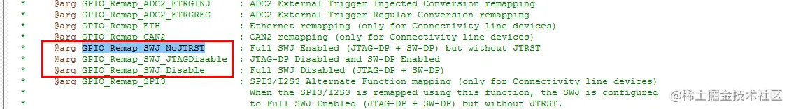 GPIO_Remap_SWJ_NoJTRST 是使能JTAG和SW功能,但是不包括JTRST引脚。