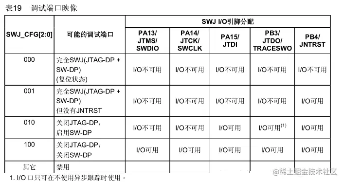 要将JTAG占用的这些口设置为普通IO口时,需要用复用功能重映射,在程序开始执行时将JTAG口重映射为普通IO口。