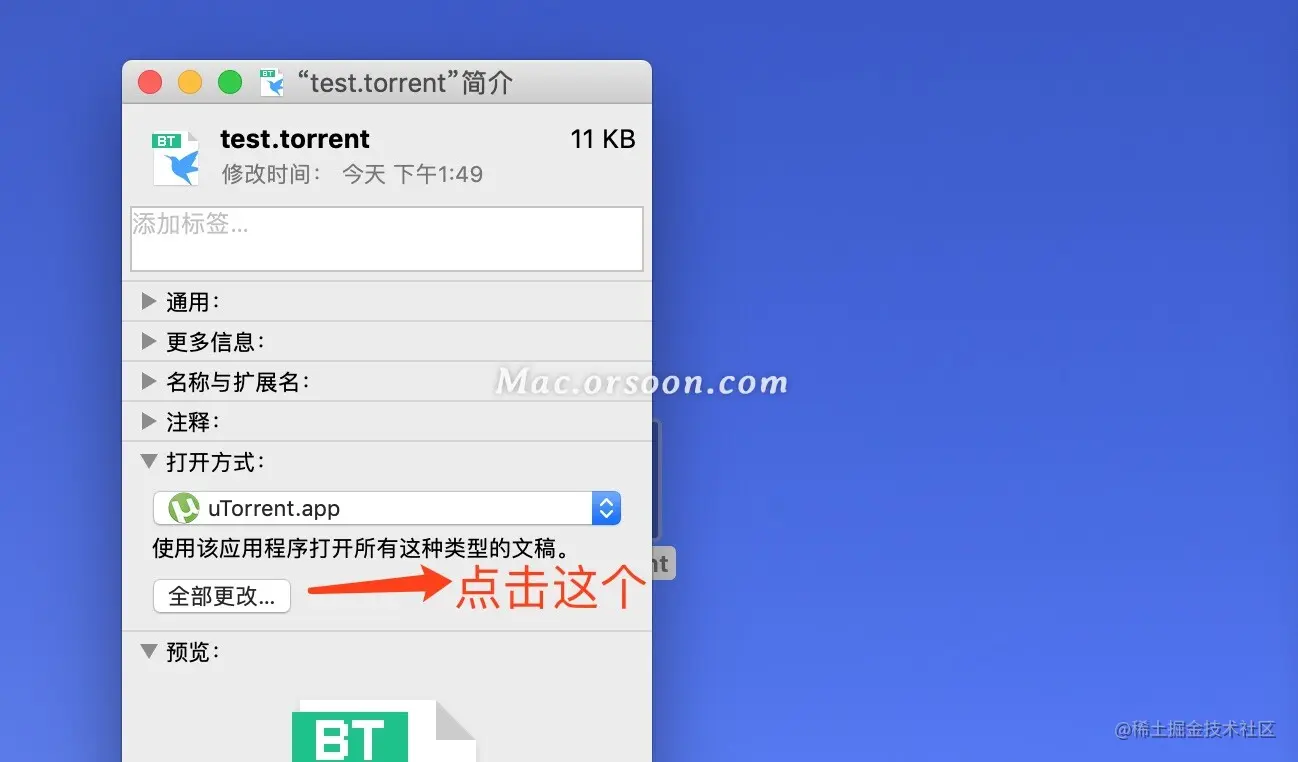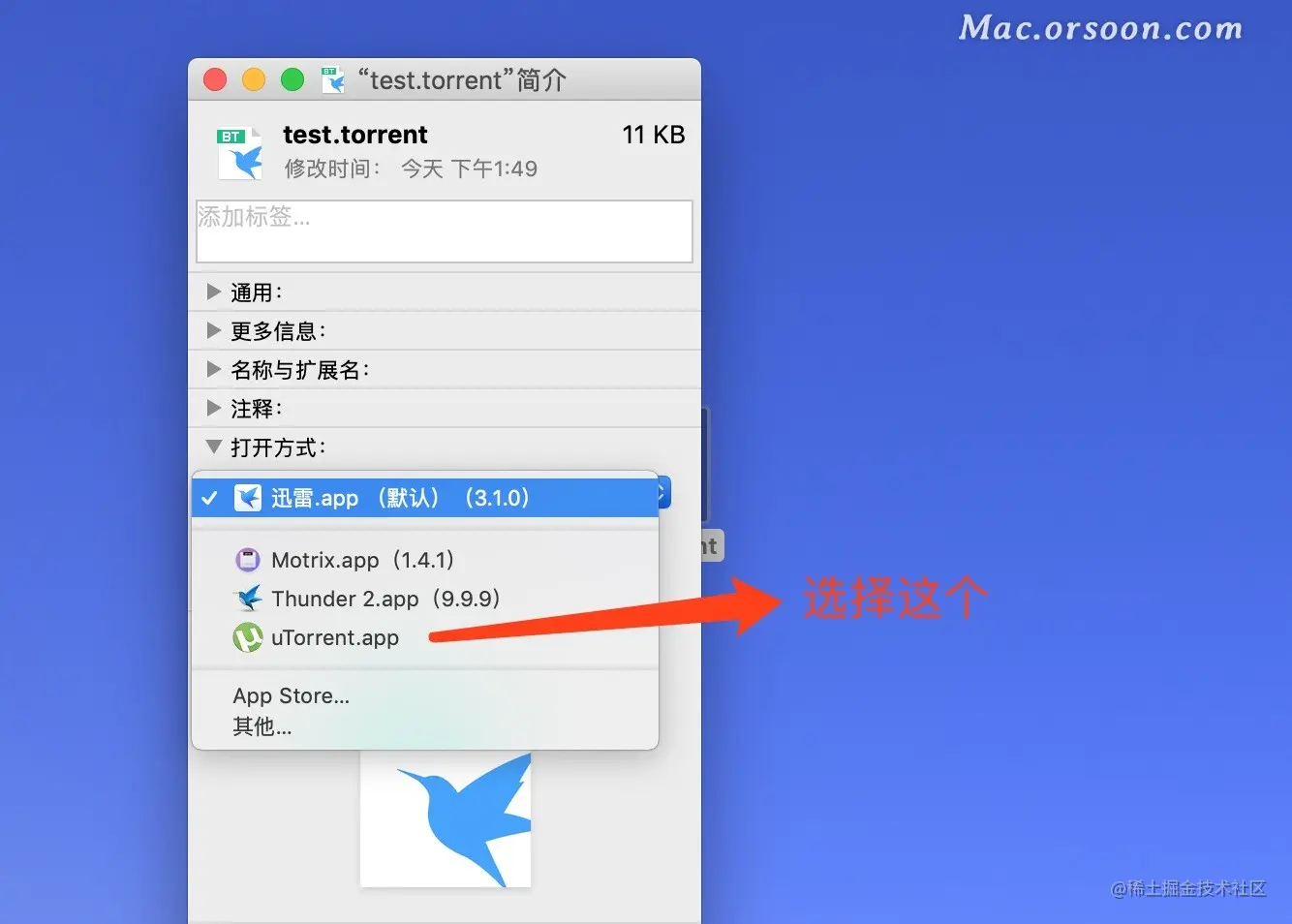 3、在弹出的文件简介中,在打开方式这一栏中选择需要选择为默认打开方式的软件。这里我们选择 uTorrent.app做为默认打开方式。如果下拉列表中没有你想要的软件,选择其它然后在应用程序中选择你需要的应用软件即可