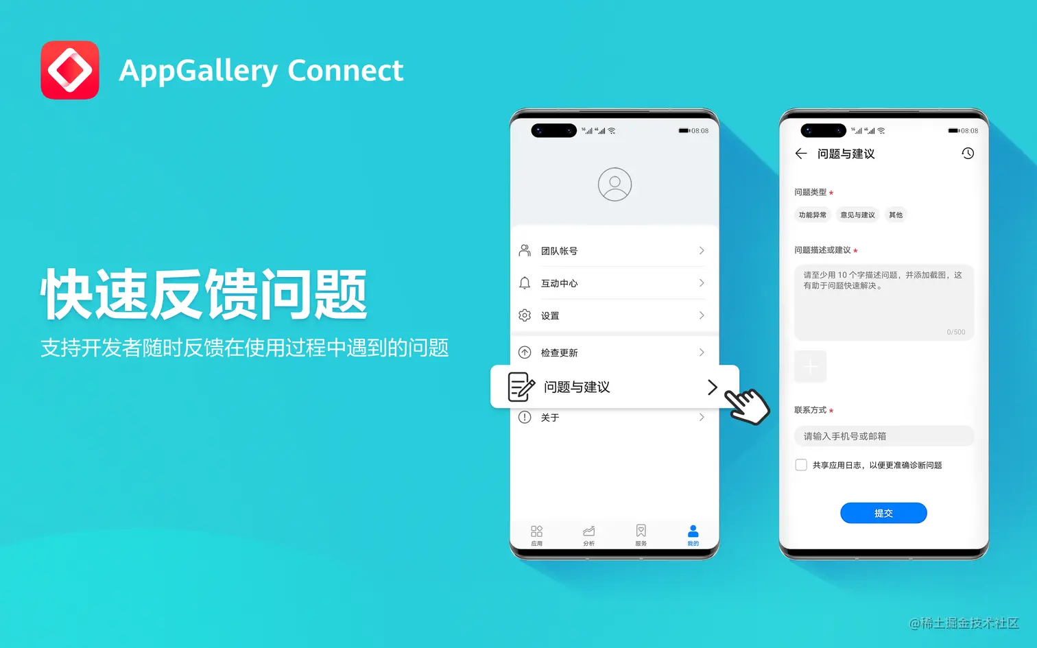 AppGallery Connect App是开发者提升应用管理和运营效率的好帮手。若您对本应用有任何建议与诉求,或在使用中遇到任何问题,都可以在“我的”页面,反馈相关信息。为了更准确地定位问题,您还可以选择上传应用的日志文件。