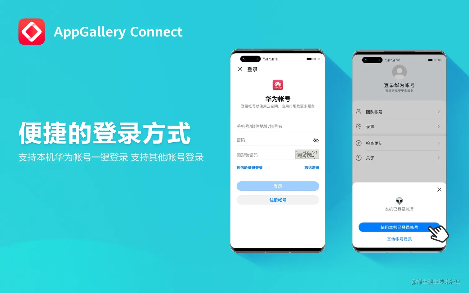 华为应用市场#AppGallery Connect#移动端App的帐号登录功能更新。现在,您不仅可以使用“本机华为帐号”一键登录,还可以使用“其他帐号登录”,实现更为灵活的登录体验。