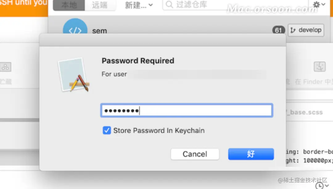 解决在Mac上操作sourcetree反复要求输入密码的问题 Mac迪迪卫 2021-06-16 777 阅读1分钟 在装完sourcetree之后,无论是 拉取 还是 推送 代码 都是提示弹层输入密码,怎么办? 复制以下代码到终端上执行一下: git config --global credential.helper osxkeychain 然后输入电脑开机密码,并且勾选始终允许即可。 问题解决!!!可以安心的push和pull代码了~