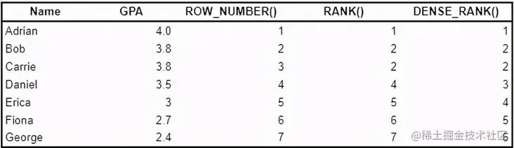 dense_rank()类似于等级(),除了重复等级后没有间隙。请注意,使用dense_rank(),Daniel排名第3,而不是第4位()。