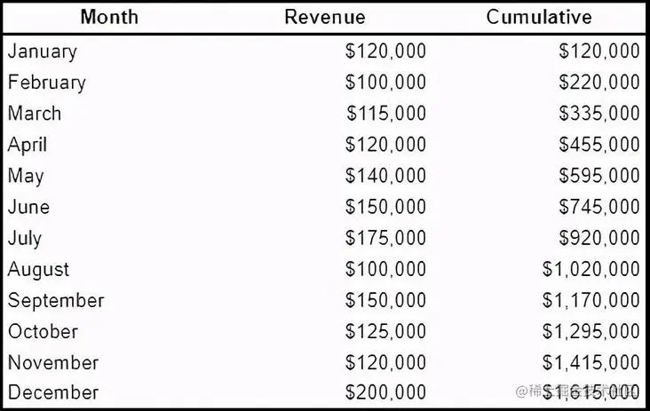 SELECT Month , Revenue , SUM(Revenue) OVER (ORDER BY Month) AS Cumulative FROM monthly_revenue