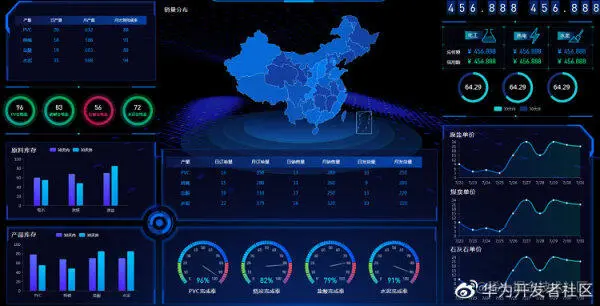 BI 数据可视模块选择的是华为云 DLV 服务,以大屏场景为主。华为商城某次大促活动需要临时加一个指挥大屏看数据,2 个开发人员加了 2 小时班,一个做前台,一个处理数据逻辑,很快完成了 0.1 版本并发布,之后再持续迭代优化效果。