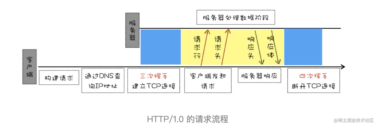 为了让客户端和服务器能更深入地交流,HTTP/1.0 引入了请求头和响应头,它们都是以 Key-Value 形式保存的,在 HTTP 发送请求时,会带上请求头信息,服务器返回数据时,会先返回响应头信息。HTTP/1.0 具体的请求流程可以参考下图: