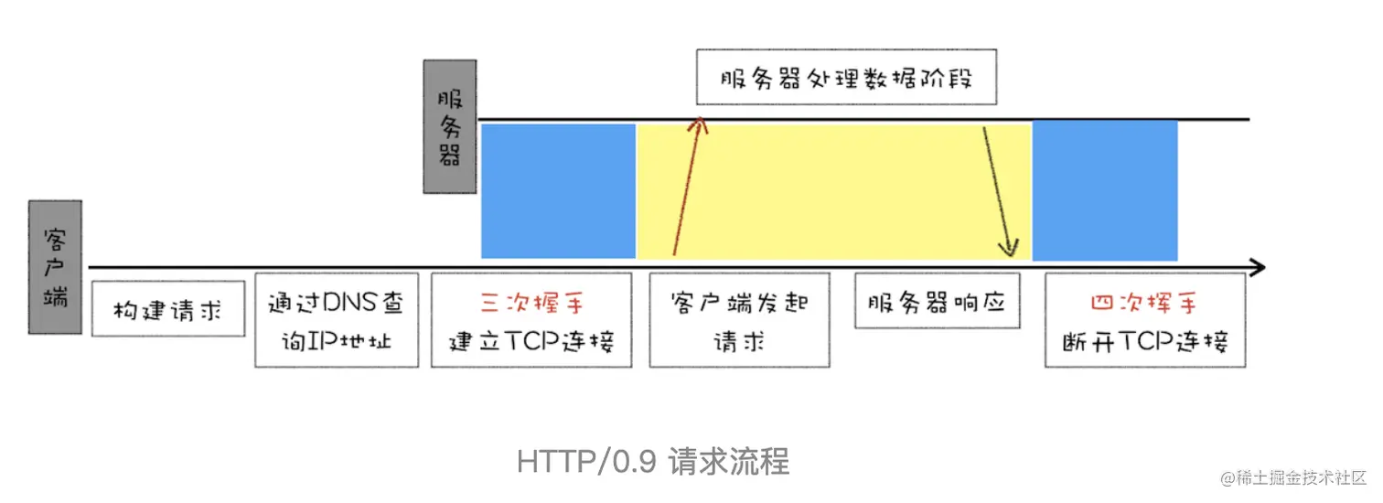 最开始出现的HTTP/0.9实现相对较为简单:采用了基于请求响应的模式,从客户端发出请求,服务器返回数据。