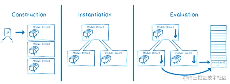 构造。查找、下载并解析所有文件到模块记录中。实例化。在内存中寻找一块区域来存储所有导出的变量(但还没有填充值)。然后让 export 和 import 都指向这些内存块。这个过程叫做链接(linking)。求值。运行代码,在内存块中填入变量的实际值。