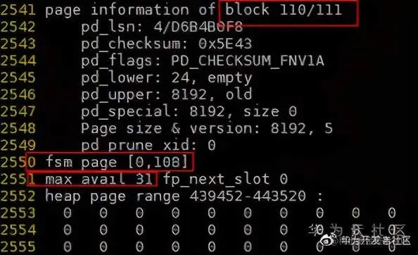 6. 第 111 个 block 显示,最大空闲空间为 31。FSM 总块 111 个,块号 110,减去前面的两个非叶子层的 block,为 108,正好对应前面第二个 block 中的第 108 个 slot(存 31)。