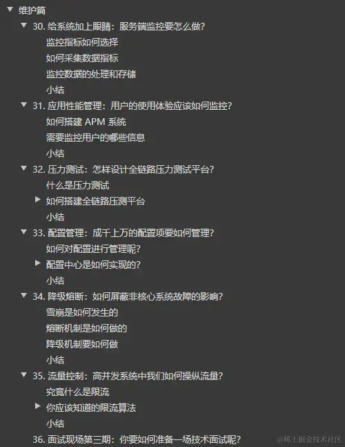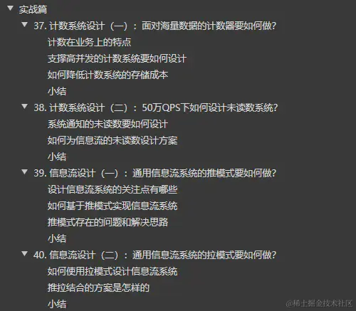 以未读数系统设计和信息流设计为例展开介绍。未读数系统实战,主要讲解如何设计方案来抵挡每秒几十万次的获取用户未读数的请求;信息流设计实战,讲解如何做通用信息流系统的推模式与拉模式。实战篇内容操作性强,能检验你对技术点的掌握程度,和灵活运用的程度,完善你知识体系的重要环节。