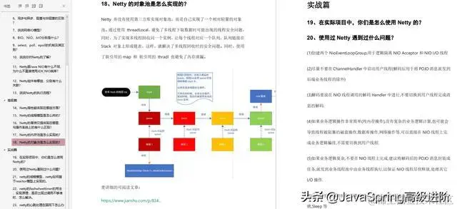 整理一份Netty面试题清单,这些面试题经常出现在互联网网络编程面试中。从基础到高级, 如果你都能回答出来,说明你非常熟练,甚至即将能步入精通Netty了。为了不影响阅读,在这以截图形式展示目录与部分内容,整理收集不易有需要的朋友麻烦帮忙转发后关注文末公众号获取吧