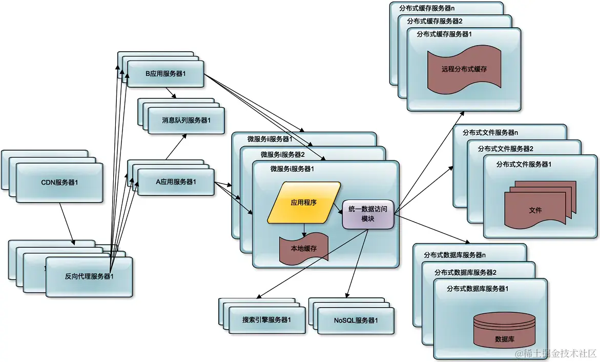 对于大多数的互联网应用而言,这样的分布式架构就已经可以满足用户的并发访问压力了。但是对于更大规模的互联网应用而言,比如新浪微博,还需要解决海量数据的存储与查询,以及由此产生的网络带宽压力以及访问延迟等问题。此外随着业务的不断复杂化,如何实现系统的低耦合与模块化开发、部署也成为重要的技术挑战。