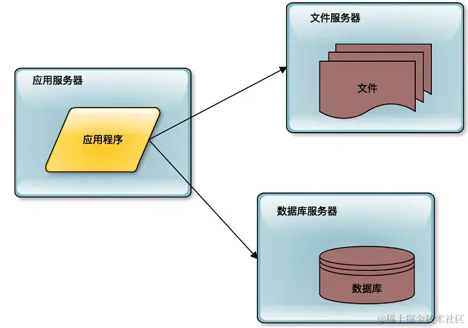 前面单机的时候,数据库和应用程序是部署在一起的。进行第一次分离的时候,应用程序、数据库、文件系统分别部署在不同的服务器上,从 1 台服务器变成了 3 台服务器,那么相应的处理能力就提升了 3 倍。