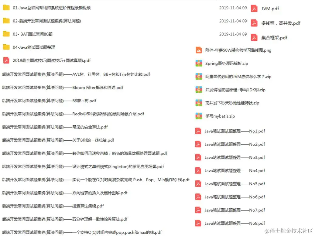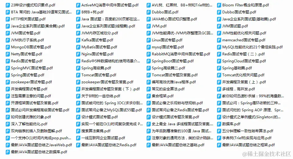 本次面试题分享到此为止,限于篇幅,没法在这里给大家分享更多的面试题; 之前很多粉丝一直私信我让我整理一些面试题,近些天终于整理好了,笔者整理了一份包含Kafka、Mysql、Tomcat、Docker、Spring、MyBatis、Nginx、Netty、Dubbo、Redis、Netty、Spring cloud、分布式、高并发、性能调优、微服务等架构技术的面试题和部分视频学习资料;