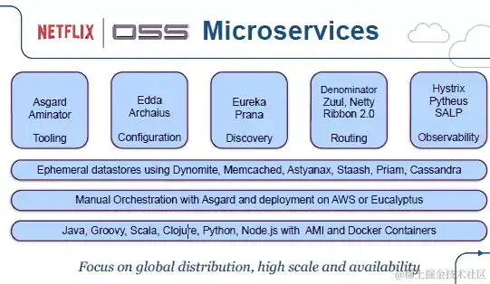 Netflix的微服务架构如下,着重全球分发 高可扩展性和可用性: