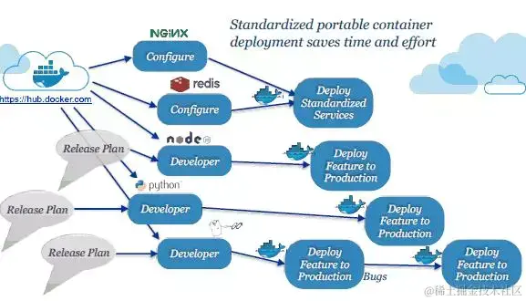 由于Docker引入,不同的微服务可以使用不同的技术架构,比如Node.js Java Ruby Python等等,这些单个的服务都可以独立完成交付生命周期,如下: