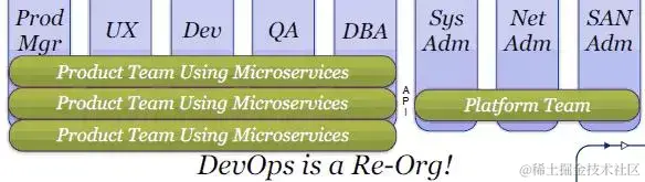 微服务促进了DevOps方式的重组,将一个大臃肿的整体产品开发队伍切分为根据不同微服务的划分的产品队伍,以及一个大的整体的平台队伍负责运营管理,两者之间通过API交互,做到了松耦合隔绝。