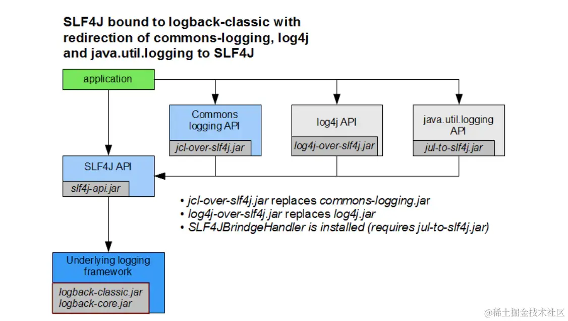上图中的右侧部分就揭示了方法,打个比方,如果我们依赖Spring,虽然Spring默认使用的是JCL,要想在项目中统一使用slf4j+logback的话,很简单,我们先排除掉 JCL的依赖,然后再引入jcl-over-slf4j.jar的依赖即可。(其实就是在偷梁换柱,jcl-over-slf4j.jar和JCL在包名/类名/方法名上完全一致,只不过jcl-over-slf4j在内部调用的是slf4j的api而已,这样既可以避免Spring报错,又可以将Spring日志记录方式加以改变!)