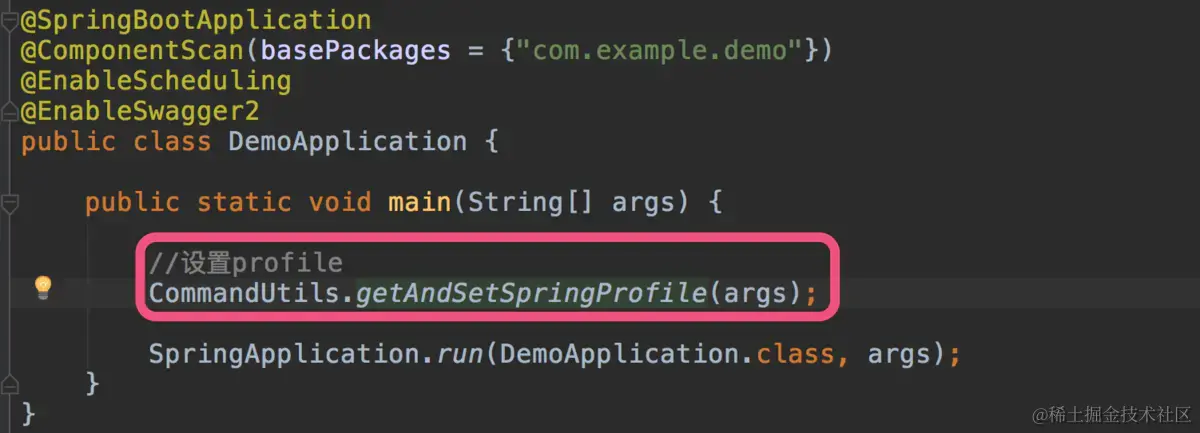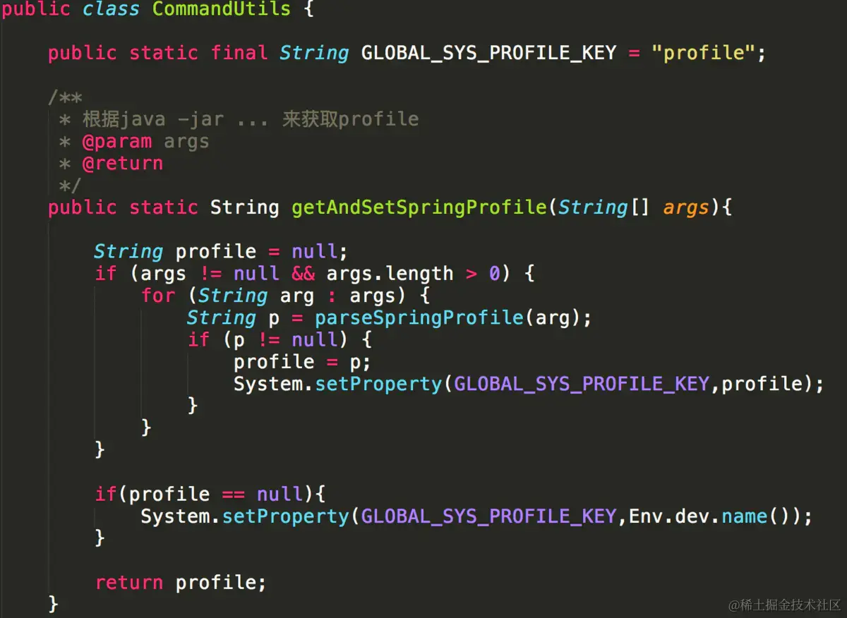我们从args进行遍历处理,如果找到profile,那么通过System.setProperty进行系统key/value的设置(这里的key为"profile"),这是为了保存profile,方便以后拿到。