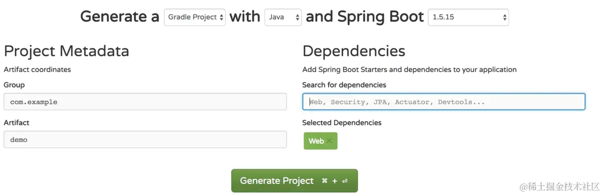 要构建一个SpringBoot应用也非常简单,我们直接通过官网(start.spring.io/)来创建一个demo应用: