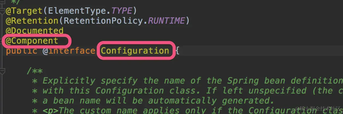 @Configuration注解标记类为配置类,其实质就是一个component,会注册到spring容器,@Bean标记在public方法上,会将方法返回值进行注册,名称就是方法的名字。