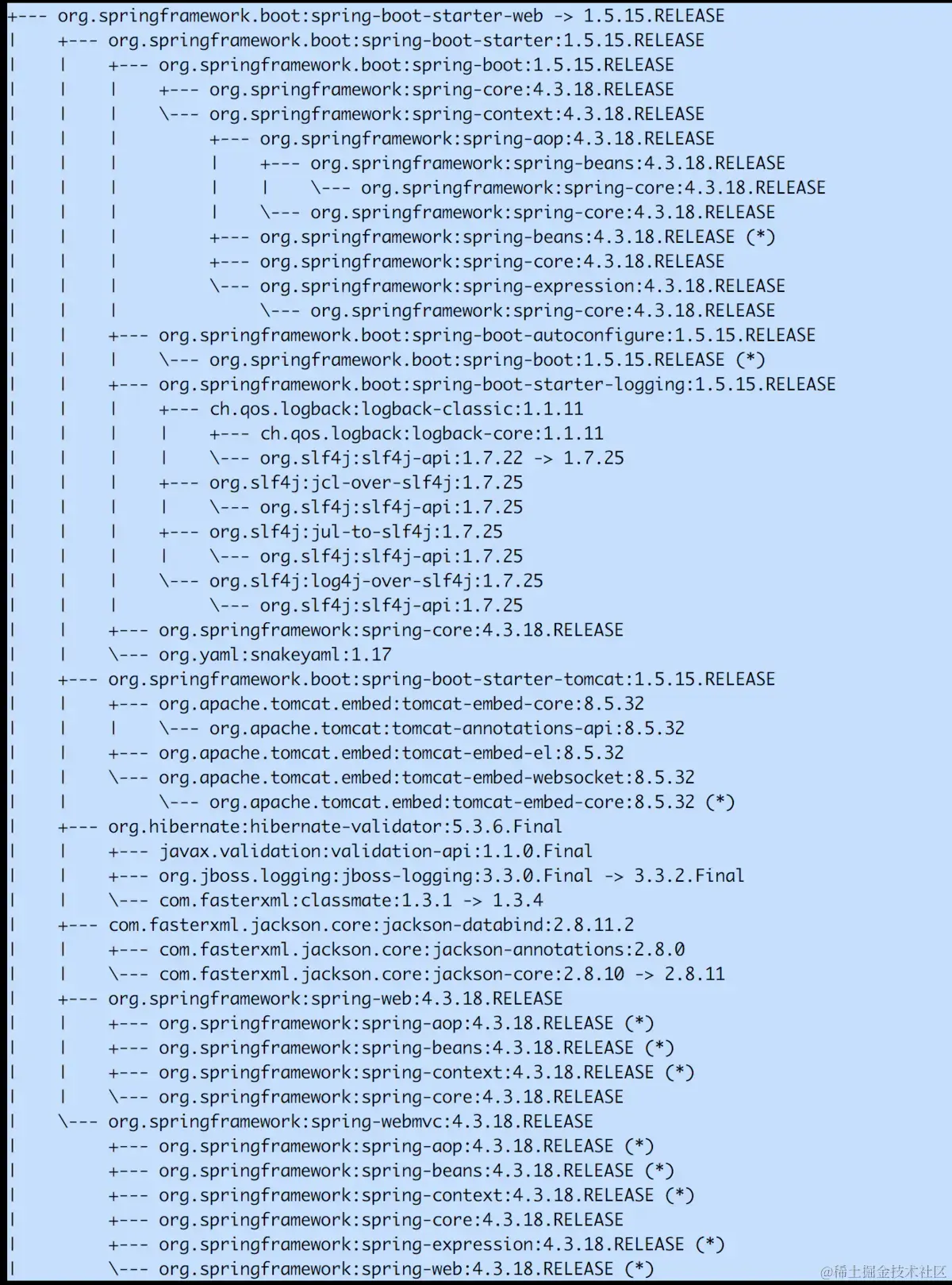 可见一个org.springframework.boot:spring-boot-starter-web就已经帮助我们整合了很多依赖了,大大简化了配置。