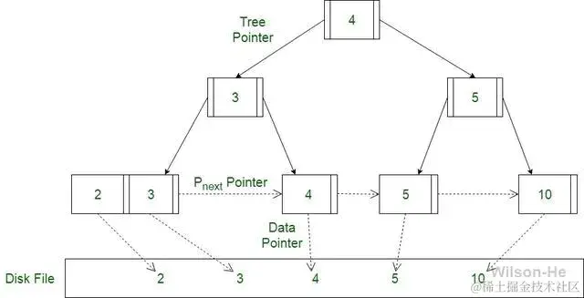 实现动态多级索引时,通常会采用B树和B+树的数据结构。但是,B树有一个缺点是它将与特定键值对应的数据指针(指向包含键值的磁盘文件块的指针)以及该键值存储在B树的节点中。该设计大大减少了可压缩到B树节点中的条目数,从而增加了B树中级别数与记录的搜索时间。 B+树通过仅在树的叶节点处存储数据指针来消除上述B树的缺点,因而B+树的叶节点结构与B树的内部节点结构完全不同。数据指针在B+树中仅存在于叶节点,因此叶节点必须将所有键值及其对应的数据指针存储到磁盘文件块以便访问。此外,叶节点也用于链接以提供对记录的有序访问。因此,叶节点才是第一级索引,而内部节点只是索引到其它级别索引的多层索引。叶节点的一些键值也出现在内部节点中,主要是作为简化搜索记录的一种媒介。 B+树与具有同级的B树相比,具有同级的B+树可以在其内部节点中存储更多键,显着改善对任何给定关键字的搜索时间,同样的键数B+树级别较低且含指向下一个节点的指针P的存在使B+树在从磁盘访问记录时非常快速有效。如设B树与B+树某一级别内部节点都有100K的容量,由于B树的节点除了存键和数据指针,所以实际存的键容量连一半50K可能都没有,但B+树的100K容量都用于存键了,所以索引自然更高效。