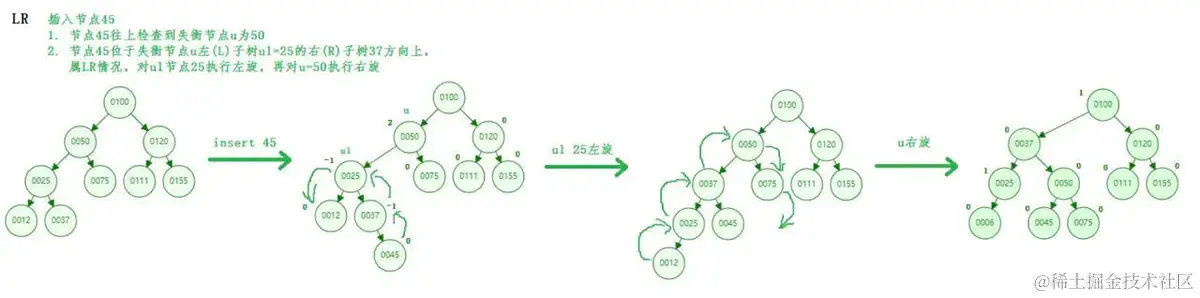 - 左右旋转:用于平衡LR情况,对失衡节点失衡u的左子节点ul左旋,再对失衡节点u右旋